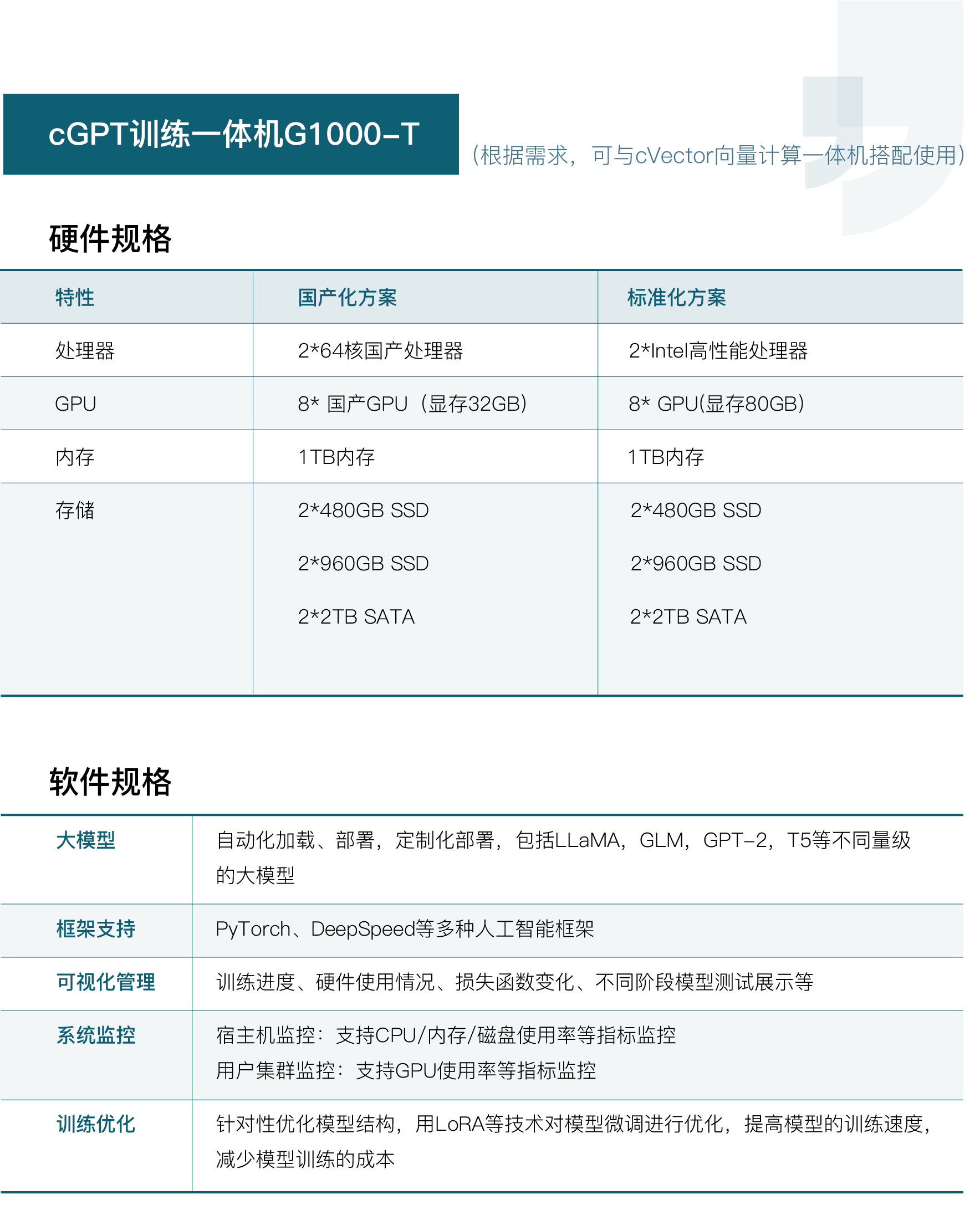 南京云創(chuàng)大數(shù)據(jù)科技股份有限公司自主研發(fā)的cGPT大模型訓練推理一體機,是一款統(tǒng)一的大模型訓練和推理平臺,可以實現(xiàn)對大模型的全生命周期管理,包括數(shù)據(jù)集的管理,模型的訓練、評估和推理,平臺性能的監(jiān)控和管理等。cGPT大模型訓練推理一體機支持海量數(shù)據(jù)私有化、本地化訓練部署和推理、全面支持國產(chǎn)化,能更好地適應中國的語言環(huán)境和文化背景,滿足中國用戶的需求。在保證用戶數(shù)據(jù)隱私的前提下,cGPT可廣泛應用于智能寫作、智能問答、自然語言生成、機器翻譯等多個領域。